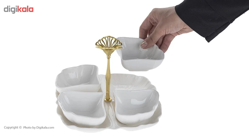 اردورخوری سرامیکی دارای ۴ عدد کاسه و یک سینی - ابعاد هر کاسه: طول ۱۱، عرض ۹.۵ و ارتفاع ۴ سانتیمتر - وزن هر کاسه: ۱۲۰ گرم - ابعاد سینی: طول ۲۰، عرض ۲۰ و ارتفاع ۲.۵ سانتیمتر - وزن سینی: ۴۲۰ گرم - دارای یک میله مرکزی فلزی با ارتفاع ۱۲ سانتیمتر - ابعاد بستهبندی: ۵.۵ × ۲۰.۵ × ۲۰.۵ سانتیمتر - وزن بستهبندی: 1800 گرم